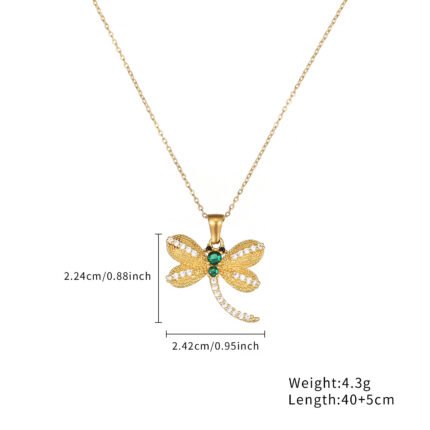 18K Gold-Plated CZ & Emerald Dragonfly Pendant Necklace | Hypoallergenic Stainless Steel Jewelry