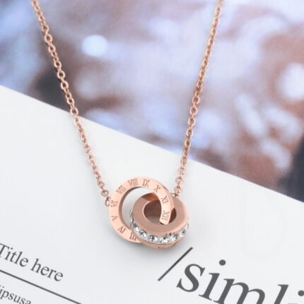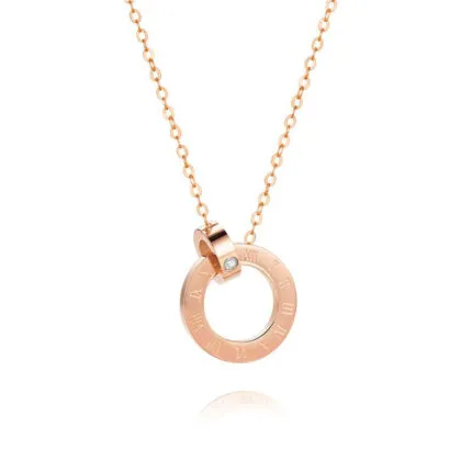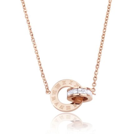 Roman Numeral Double Ring Zircon Necklace | 18K Rose Gold-Plated Titanium Steel