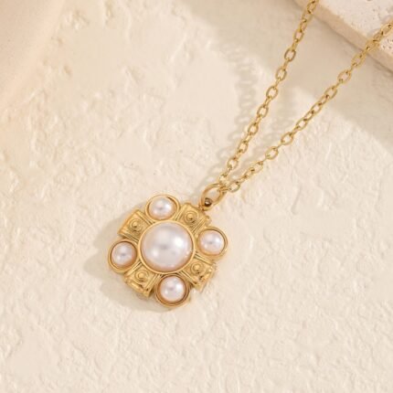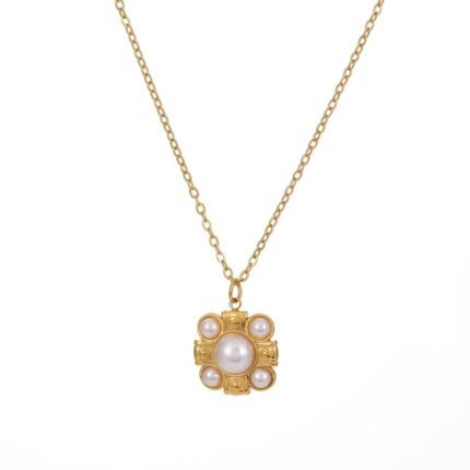18K Gold-Plated Vintage Pearl Floral Pendant Necklace | Stainless Steel Wholesale Custom Jewelry for Women
