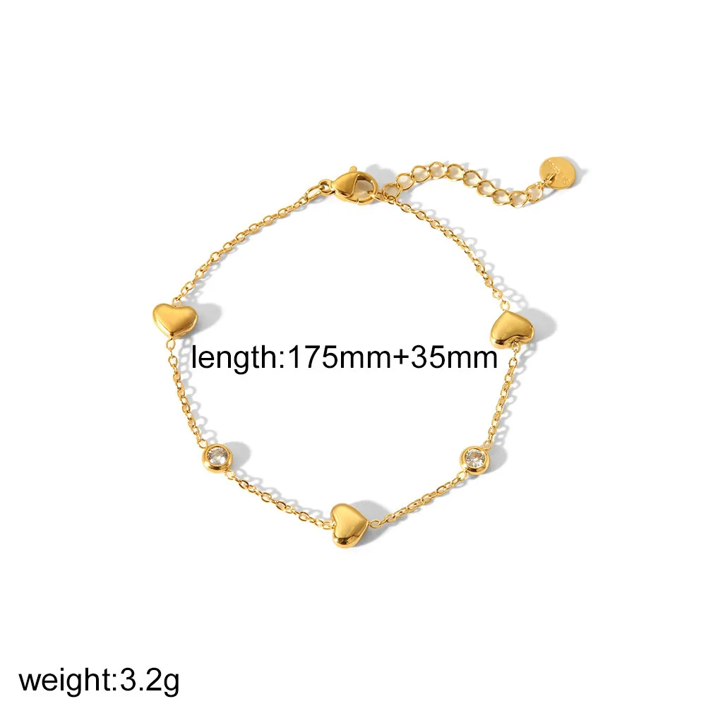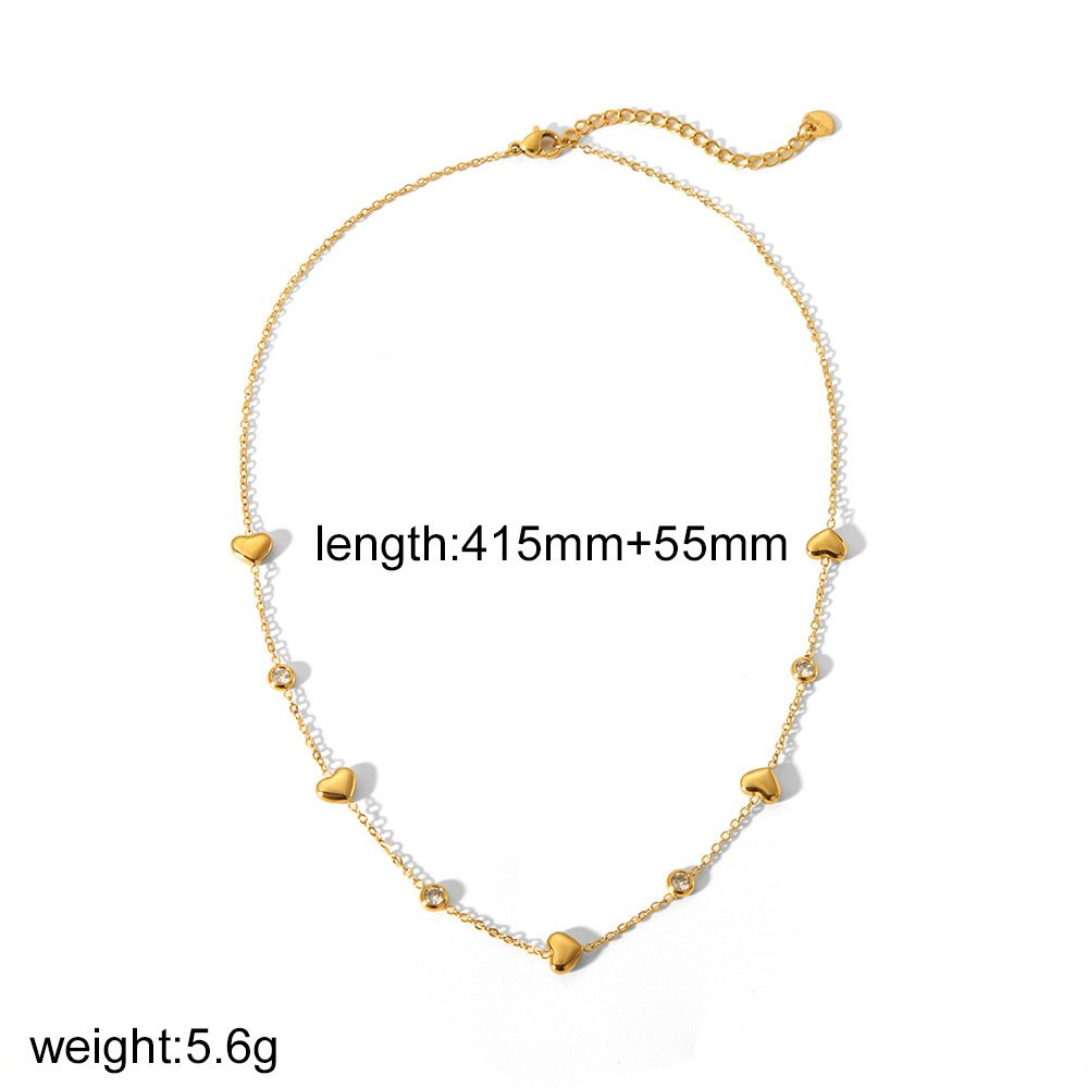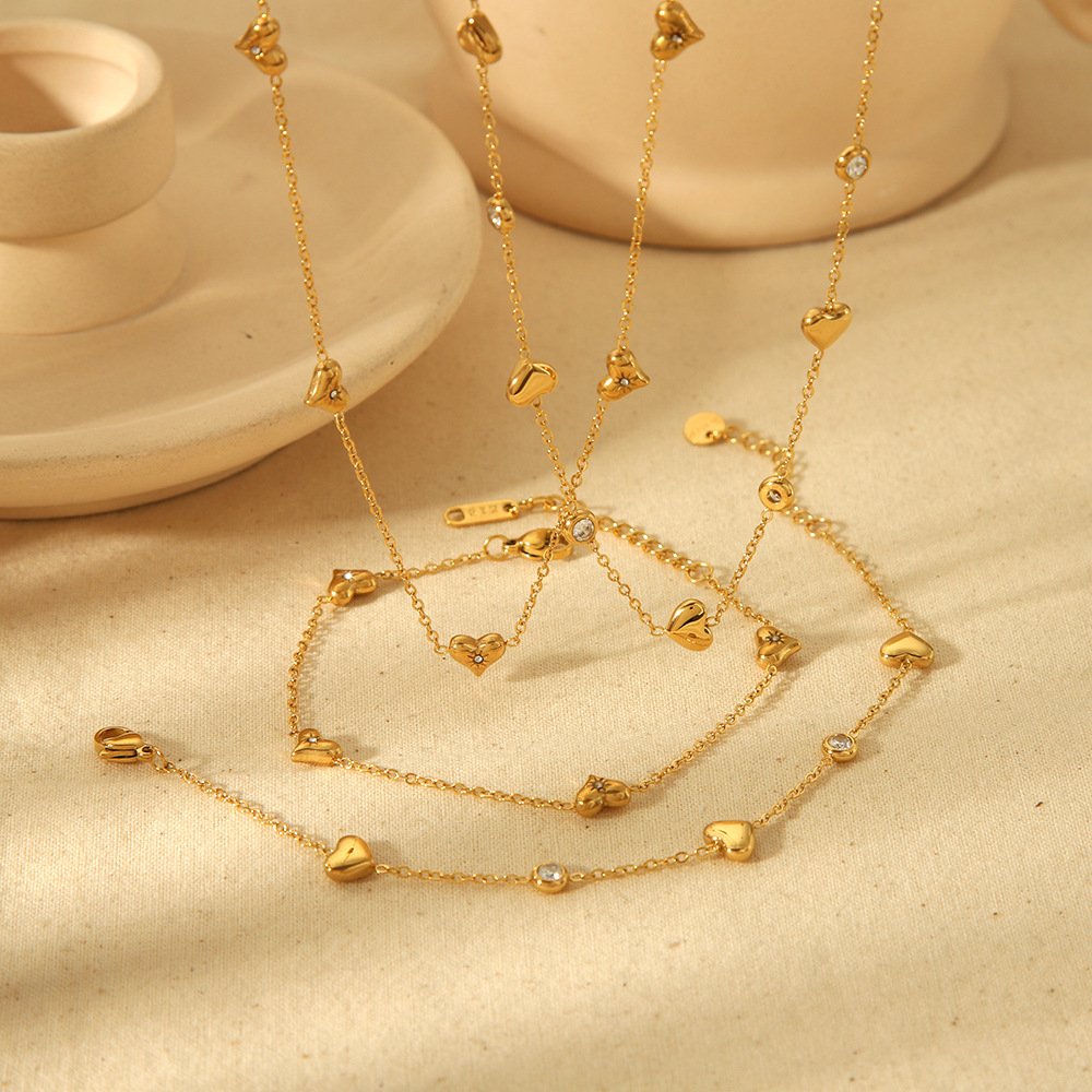 18K gold-plated stainless steel necklace and bracelet set with tiny 3D heart charms and sparkling CZ accents. Hypoallergenic, tarnish-resistant, and perfect for sweet, minimalist everyday styling and layering.