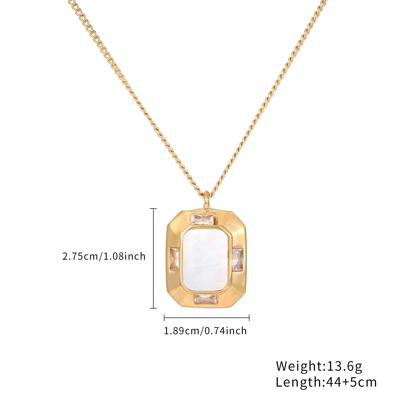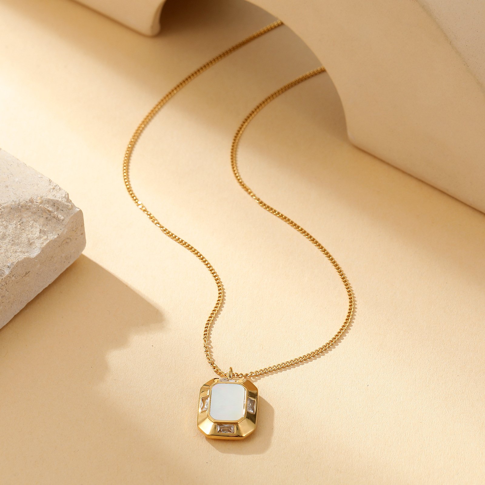 18K gold-plated stainless steel necklace with a luminous white mother-of-pearl pendant and baguette CZ accents. Tarnish-resistant, hypoallergenic, and never fades—perfect for high-end elegant styling and everyday wear.