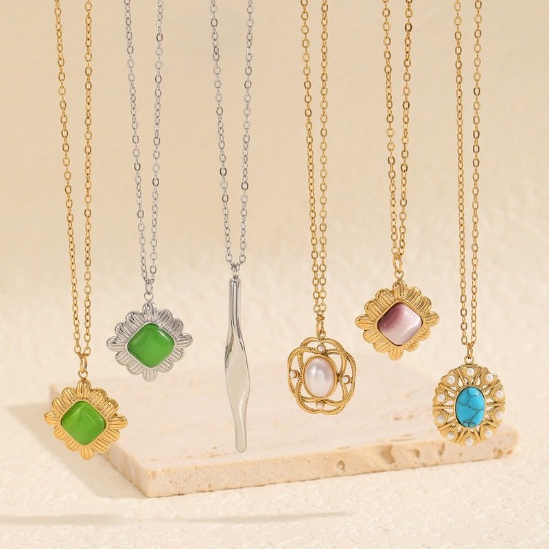 18K gold/silver plated titanium steel necklace with a vintage floral pendant and luminous purple cat’s eye stone. Hypoallergenic, tarnish-resistant, and available in two colors—perfect for elegant retro styling and wholesale.