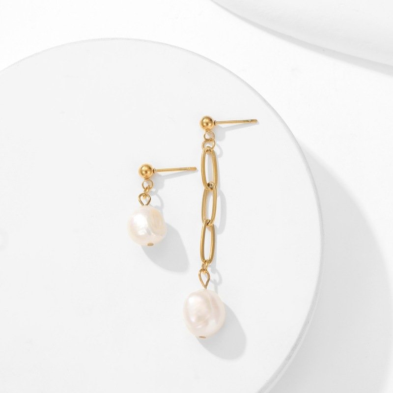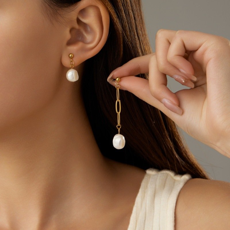 Crafted from premium stainless steel with a polished gold finish, these unique earrings feature an asymmetrical design: one side is a delicate paperclip chain with two lustrous pearl drops, while the other is a sleek huggie hoop with a single pearl. The modern aesthetic is hypoallergenic, lightweight, and versatile, making them perfect for elevating everyday style with a touch of elegant individuality.
