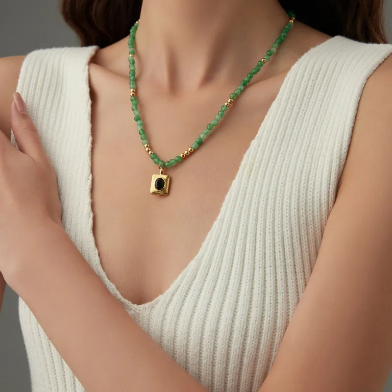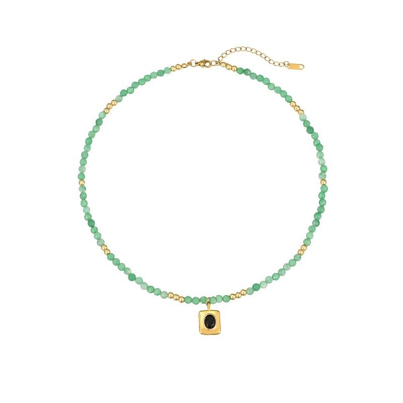 18K gold-plated titanium steel necklace with natural green aventurine beads and a black onyx square pendant. Hypoallergenic, tarnish-resistant, and never fades—ideal for boho, everyday, and minimalist styling.