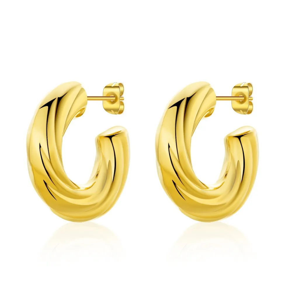 Sleek gold-tone stainless steel C-hoops with a high-shine finish. Hypoallergenic, tarnish-resistant, and perfect for minimalist everyday wear.