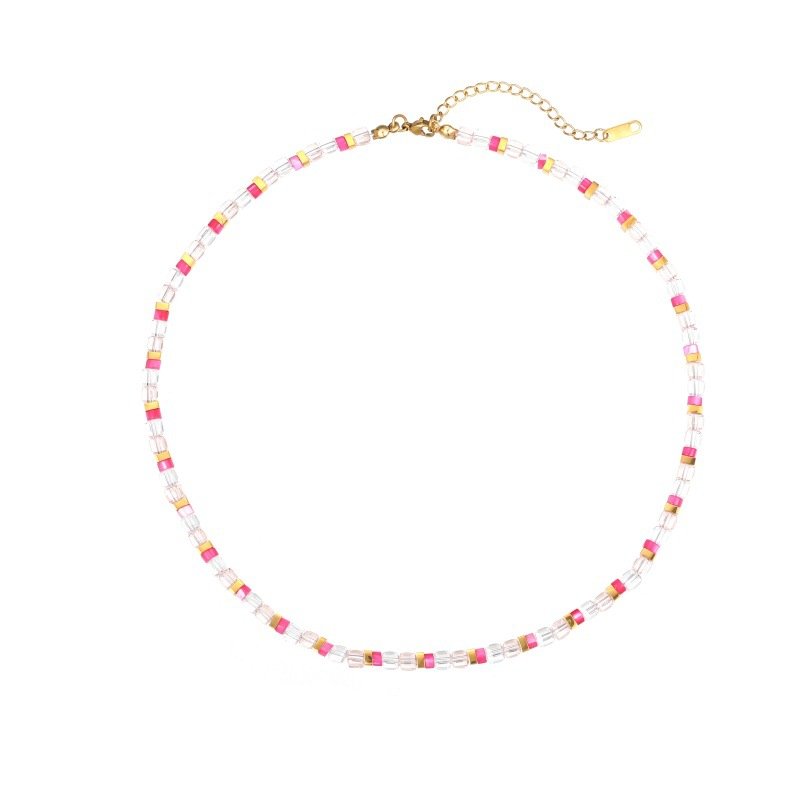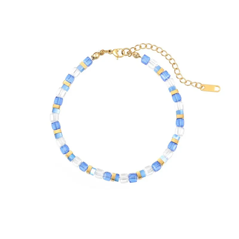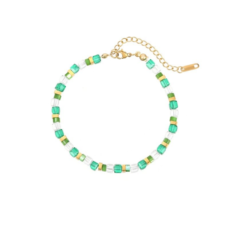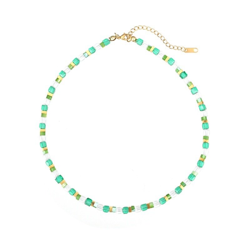 Boho beaded jewelry set with faceted square natural stone beads (green/pink/blue) and 18K gold-plated stainless steel hardware. Hypoallergenic, tarnish-resistant, and perfect for summer, beach, and everyday bohemian styling.