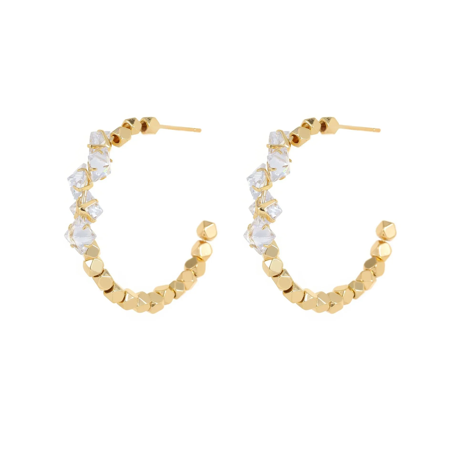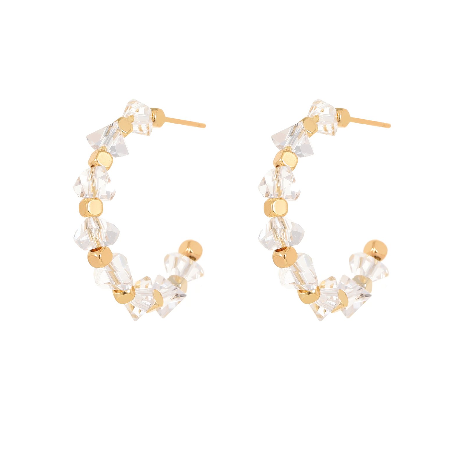 Polished gold-toned stainless steel C-hoops with faceted clear crystal beads, minimalist and commute-friendly. Hypoallergenic, non-tarnish, and lightweight for all-day office wear.