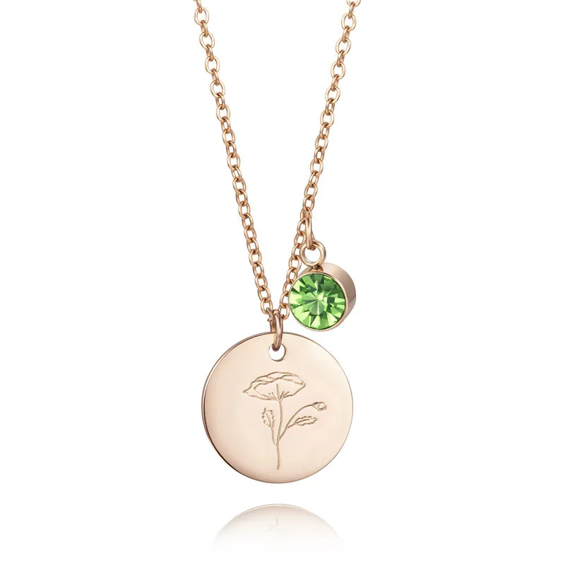 18K rose gold-plated stainless steel necklace with a carnation engraved disc and red garnet-colored zircon charm. Hypoallergenic, tarnish-resistant, ideal for gifting and everyday wear