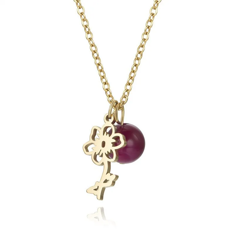 18K gold-plated stainless steel necklace with a hollow carnation pendant and red garnet-colored bead. Hypoallergenic, tarnish-resistant, ideal for gifting and everyday wear.