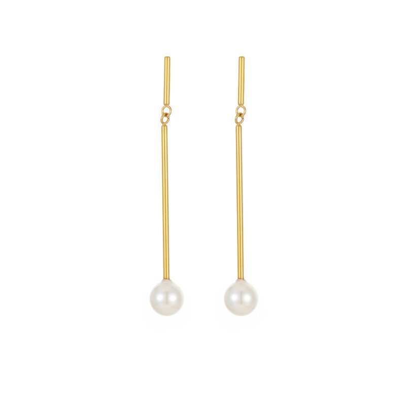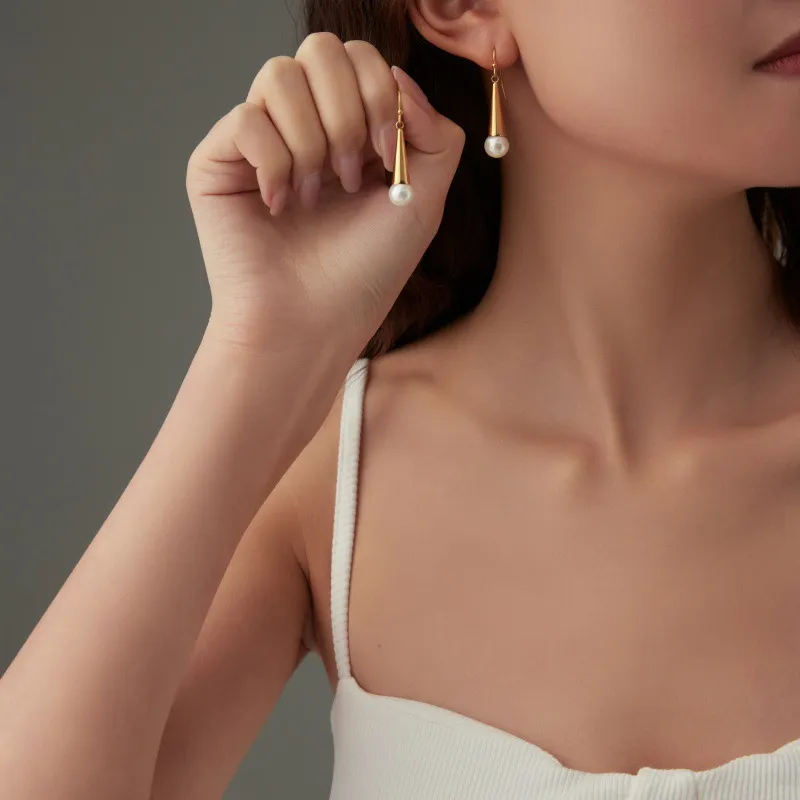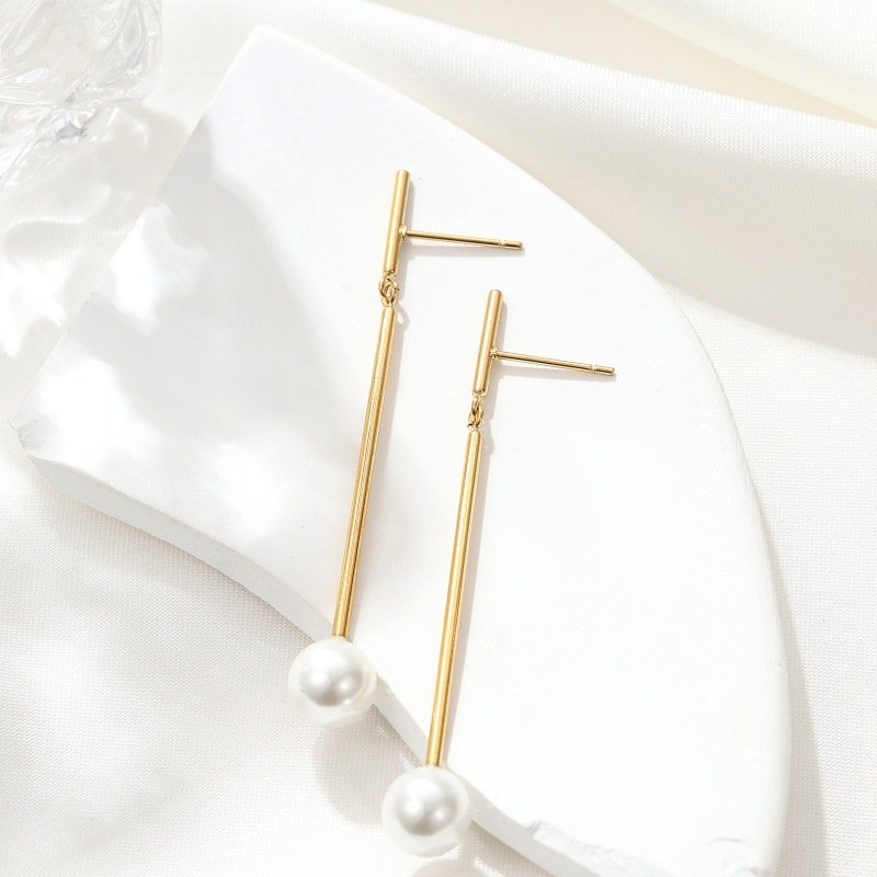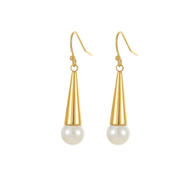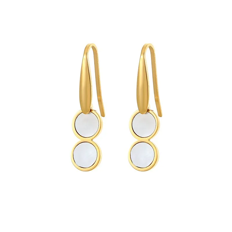 This versatile collection features three distinct drop earrings in polished gold-toned stainless steel: a pair with double white enamel circles, a pair with teardrop pearls, and a pair with delicate small pearl drops. The minimalist designs are hypoallergenic, lightweight, and perfect for elevating everyday style with understated elegance.