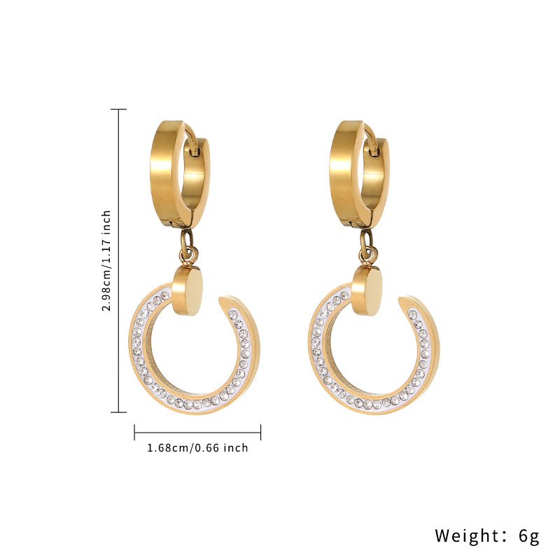These elegant drop huggie earrings feature a sleek gold-toned stainless steel huggie, paired with a C-shaped hoop pendant fully encrusted with sparkling clear cubic zirconia. Crafted from premium stainless steel, they are hypoallergenic, tarnish-resistant, and perfect for adding a touch of understated luxury to any outfit.
