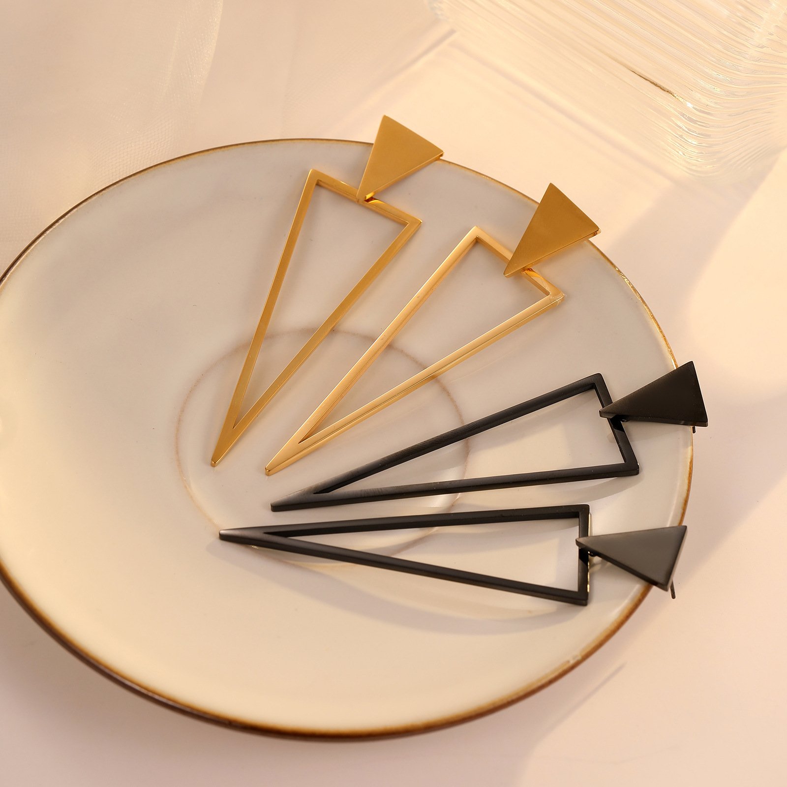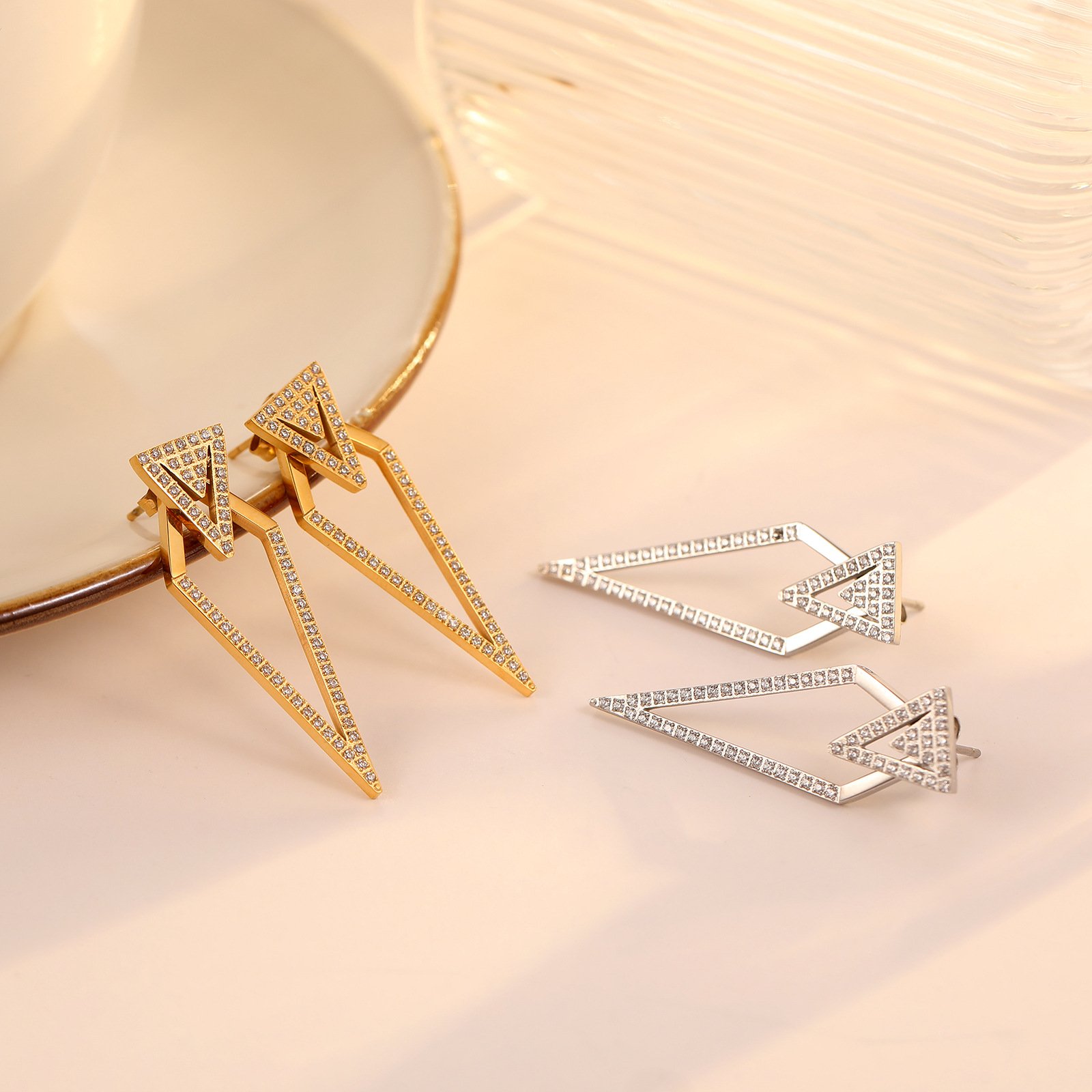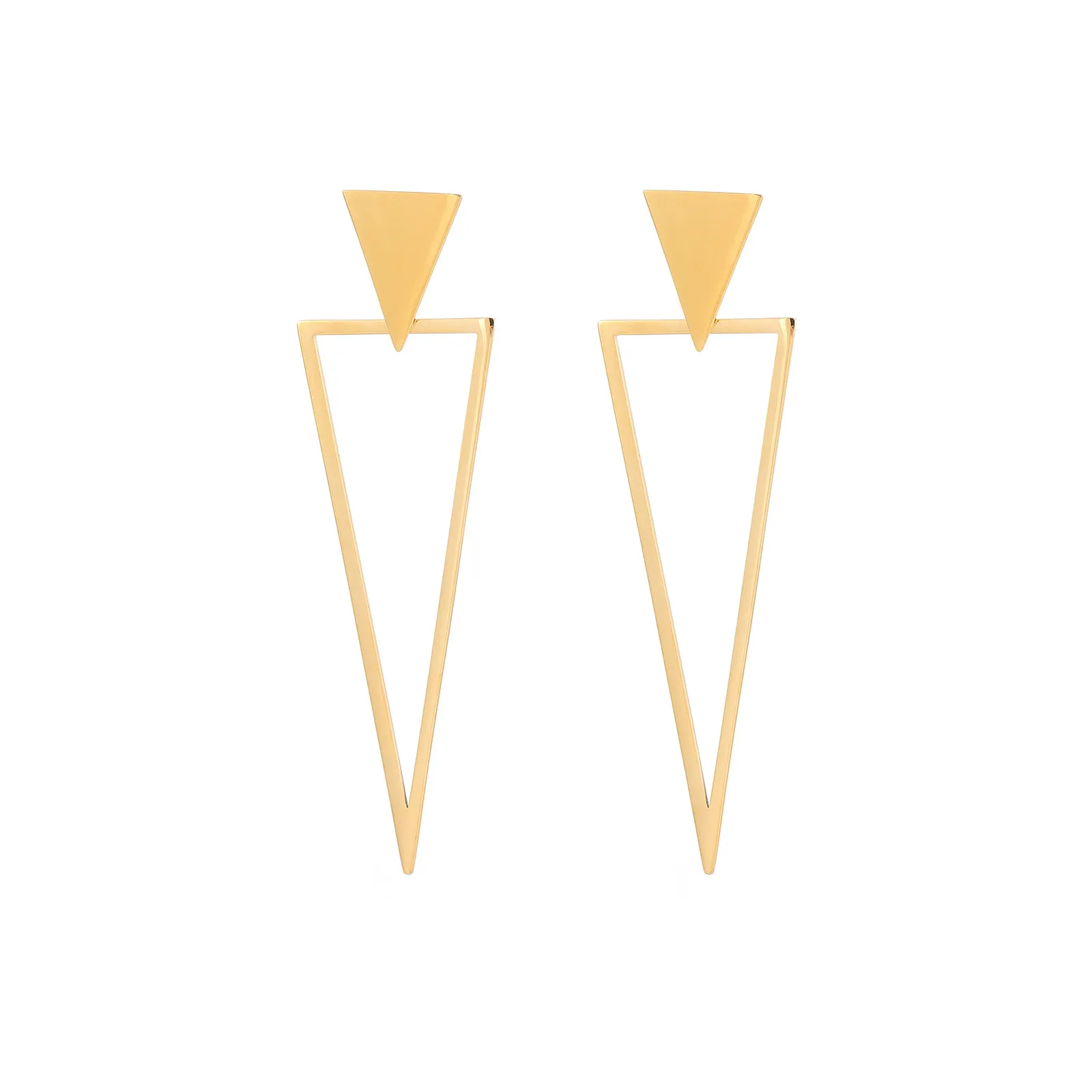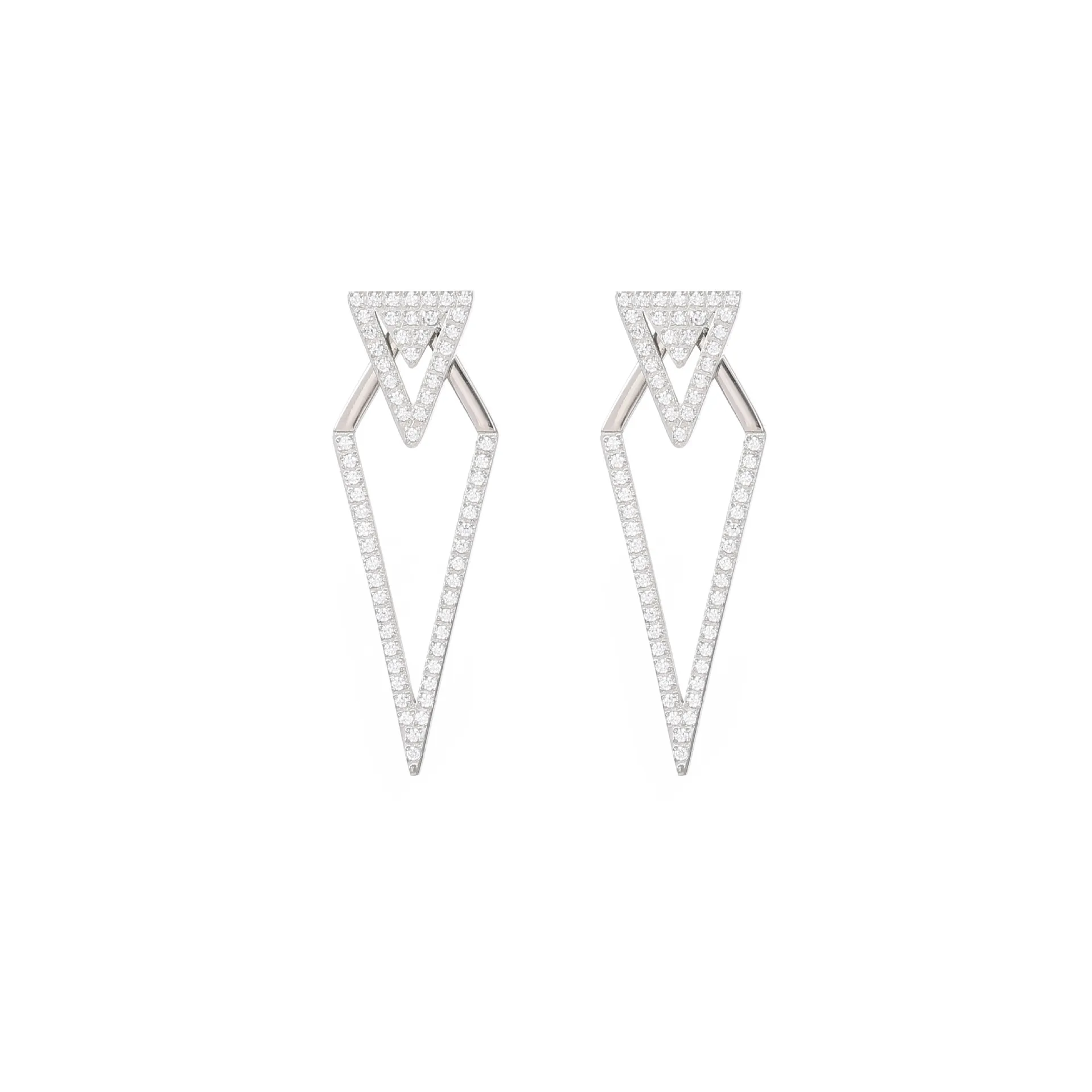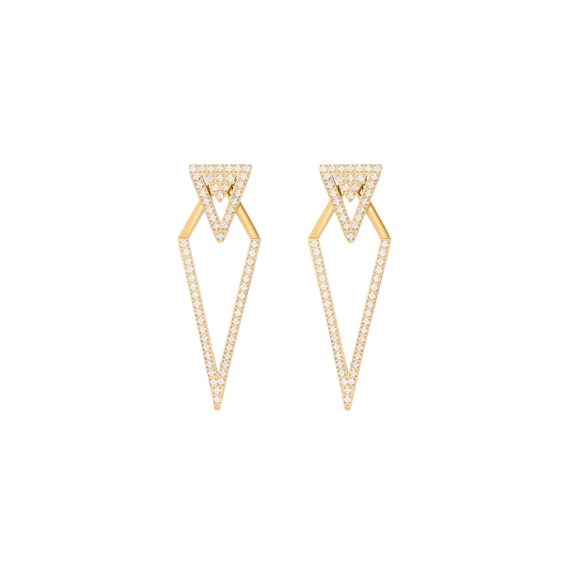 These bold, geometric earrings feature a striking double-triangle design, fully encrusted with sparkling clear cubic zirconia stones. Crafted from premium stainless steel, they are available in polished gold and silver finishes, blending modern edge with luxurious shine. Hypoallergenic and lightweight, they are perfect for making a high-fashion statement at any special occasion.