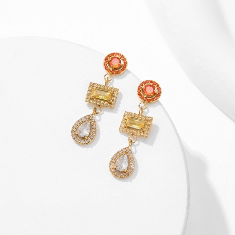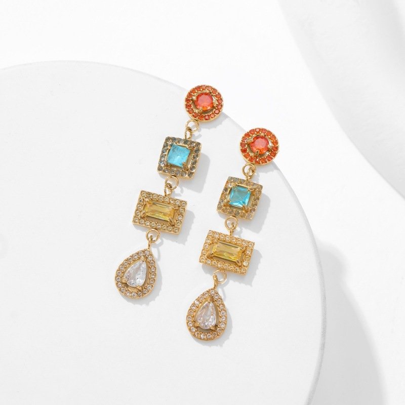 These elegant tassel drop earrings feature a cascading design of geometric gemstone pendants in vibrant red, turquoise, yellow, and clear hues, each framed by sparkling cubic zirconia. Crafted from premium stainless steel with a polished gold finish, they are hypoallergenic, tarnish-resistant, and perfect for adding a touch of understated luxury and vibrant color to any outfit.