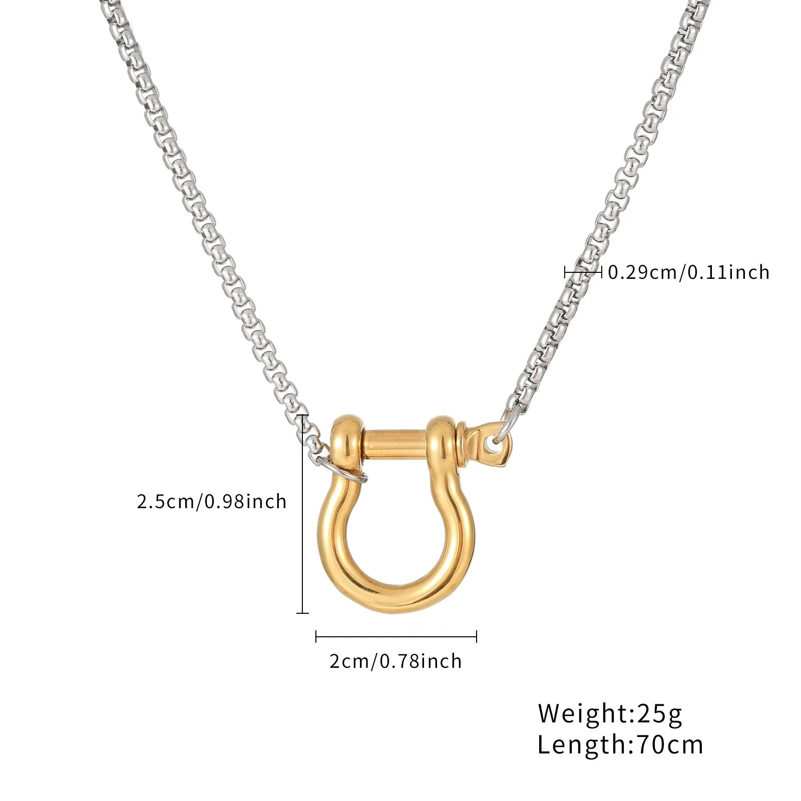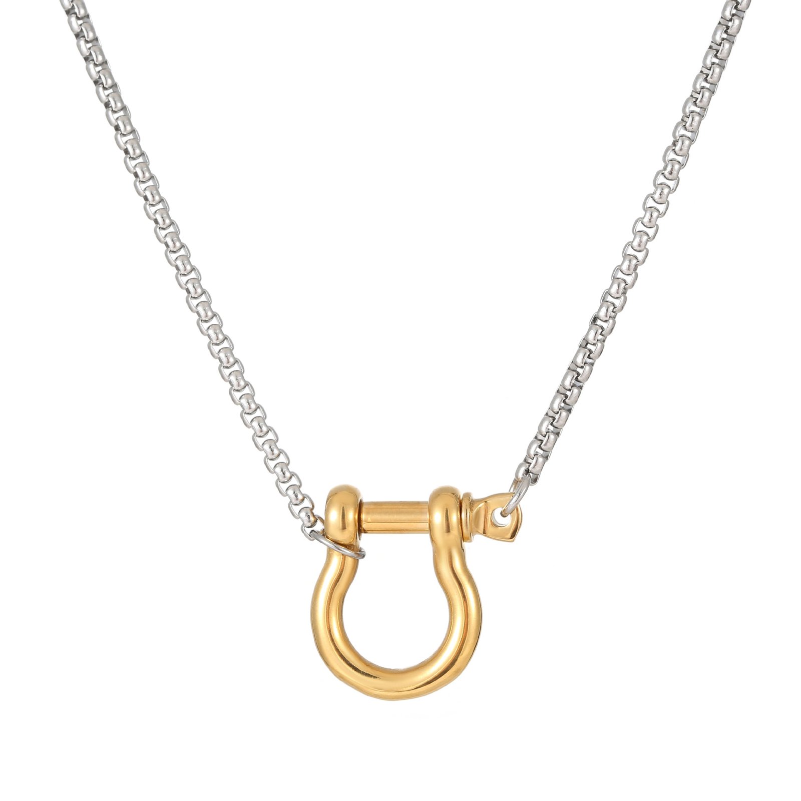 Titanium steel necklace with a silver box chain and 18K gold-plated D-shackle pendant. Hypoallergenic, tarnish-resistant, and ideal for minimalist rugged styling.