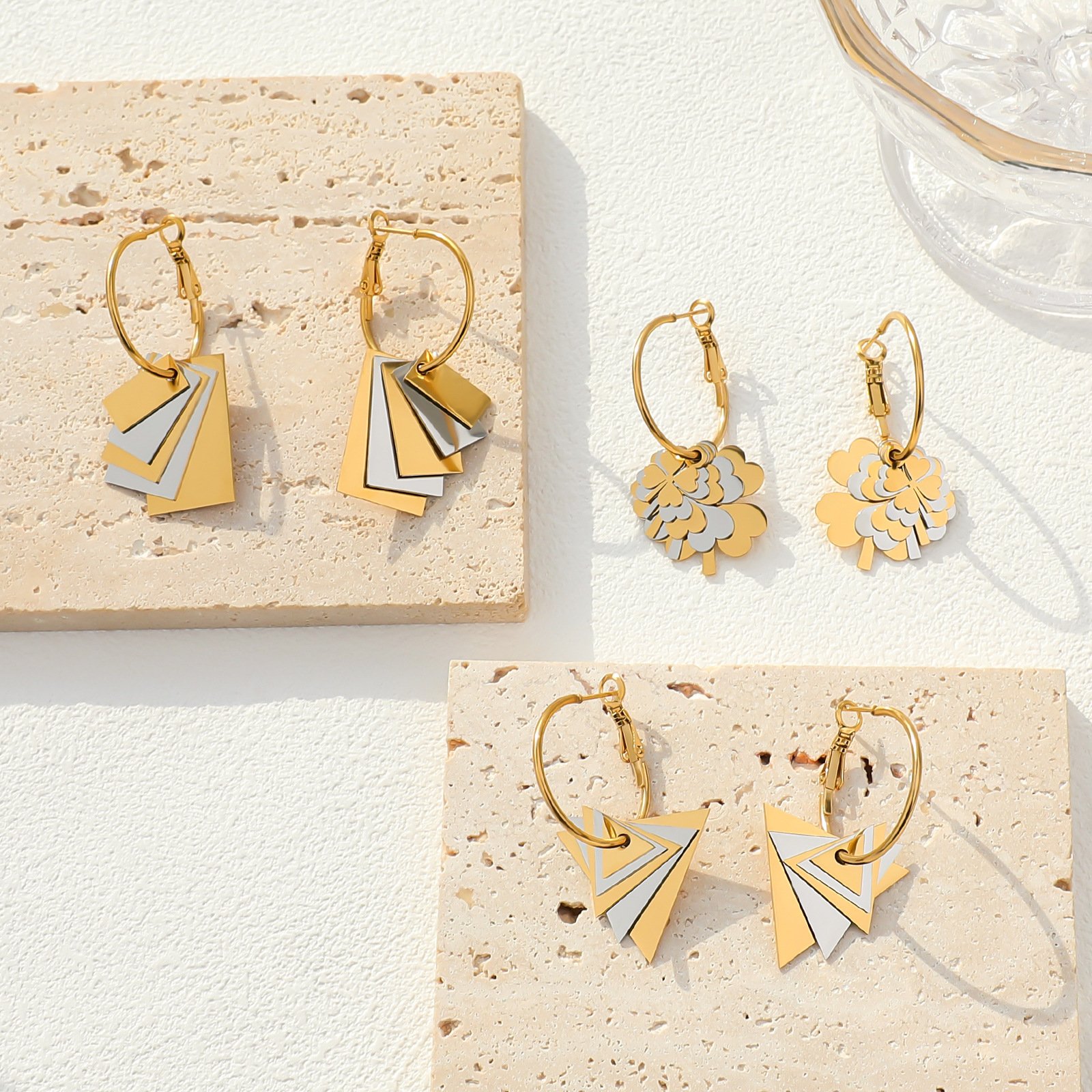 Blend French elegance and minimalist charm with these multi-layer floral triangle earrings, crafted from premium titanium steel with a sophisticated two-tone finish (gold and silver tone). Each earring features a sleek triangular hoop base, layered with delicate floral motifs that add a romantic, vintage-inspired touch. The two-tone electroplating creates a subtle contrast, elevating the design without being overly flashy. Hypoallergenic, tarnish-resistant, and lightweight, they are designed for all-day comfort, perfect for long workdays or casual outings. Ideal for pairing with office blouses, casual dresses, or everyday outfits—this versatile pair effortlessly complements any wardrobe, adding a touch of gentle sophistication and French-inspired romance to your style.