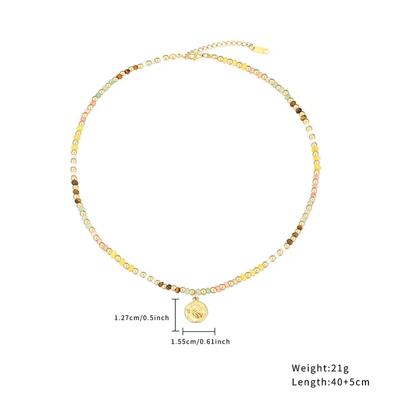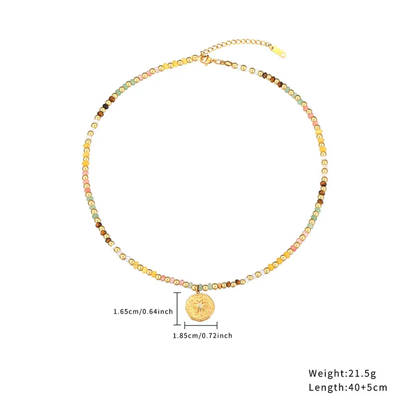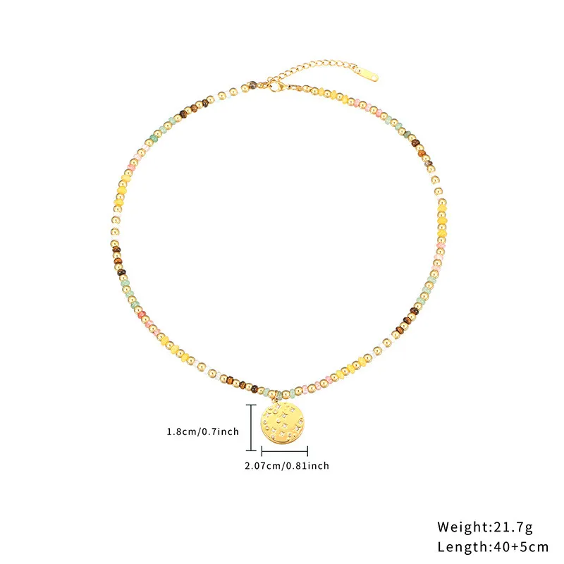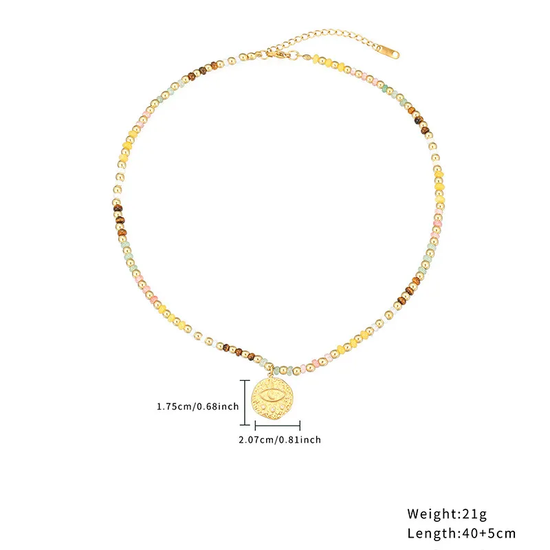 18K gold-plated stainless steel necklace with multicolor natural stone beads and evil eye/star/coin pendants. Hypoallergenic, tarnish-resistant, and never fades—ideal for boho, spiritual, and everyday styling.
