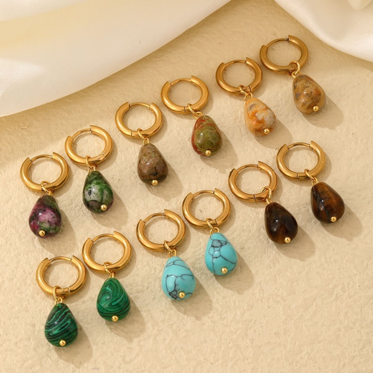 This versatile collection features gold-toned stainless steel huggie hoops, each adorned with a unique teardrop-shaped natural stone pendant, including turquoise, malachite, tiger’s eye, and jasper. The bohemian-inspired design blends earthy textures with modern durability, making them hypoallergenic and perfect for adding a touch of organic elegance to any outfit.
