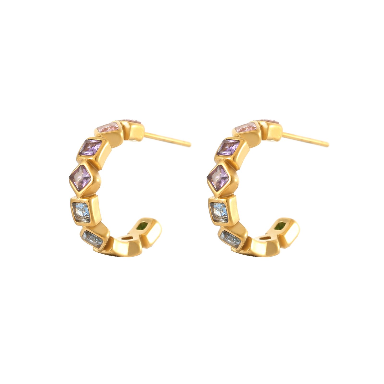 Available in three stylish variations—clear sparkling zircon, gradient pink crystal, and a mixed rainbow gem design—they are crafted from hypoallergenic, tarnish-resistant stainless steel. The lightweight C-shaped silhouette ensures all-day comfort, while the shimmering stones add a subtle yet glamorous touch to both casual and evening outfits. Ideal for elevating everyday looks or completing special occasion ensembles, these earrings are a versatile addition to any jewelry collection.
