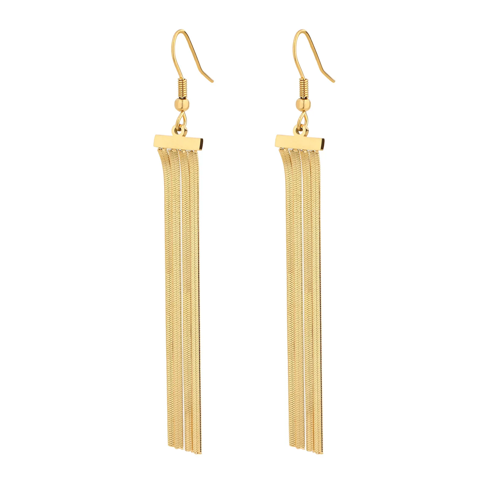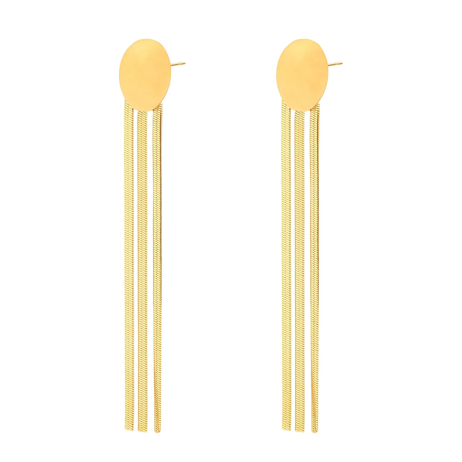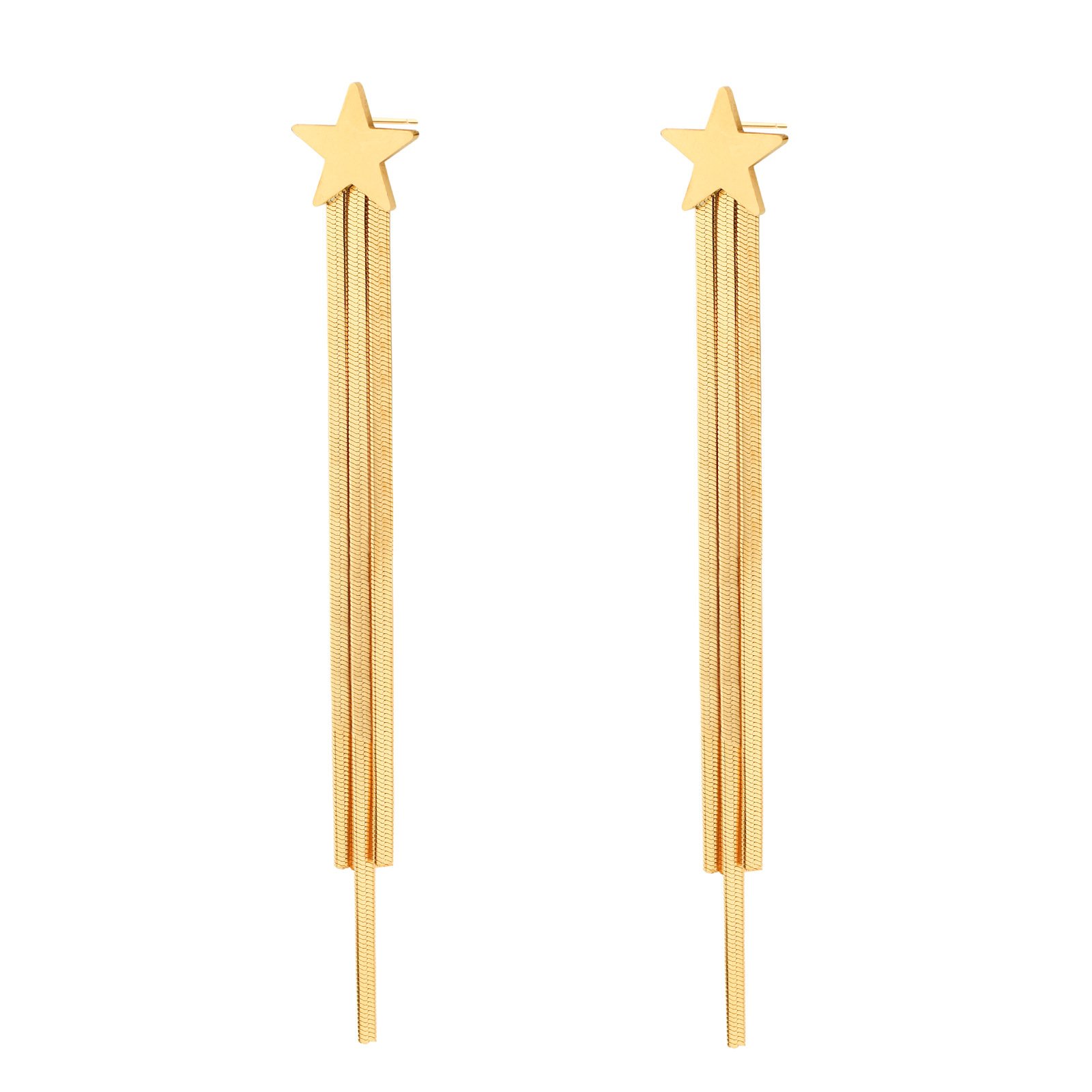 Blend celestial charm and minimalist luxury with these star tassel drop earrings, crafted from premium titanium steel with a durable 18K gold-plated finish. Each earring features a sleek geometric star stud base, from which three slender snake-chain tassels cascade, tapering into a single elongated chain for a dynamic, elongated silhouette. The polished gold tone catches light with every movement, creating a subtle yet eye-catching shimmer that embodies understated elegance. Hypoallergenic, tarnish-resistant, and lightweight, they are designed for all-day comfort while retaining their luxurious luster. Perfect for elevating evening looks, formal events, or minimalist daily outfits—this niche pair effortlessly complements any wardrobe, adding a touch of celestial glamour and modern sophistication to your style.
