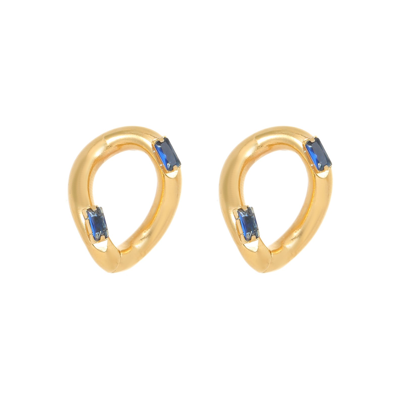 Polished gold-toned stainless steel circle earrings, available in chain-link crystal drop or teardrop blue zircon styles. Hypoallergenic, non-tarnish, and ideal for minimalist everyday wear.