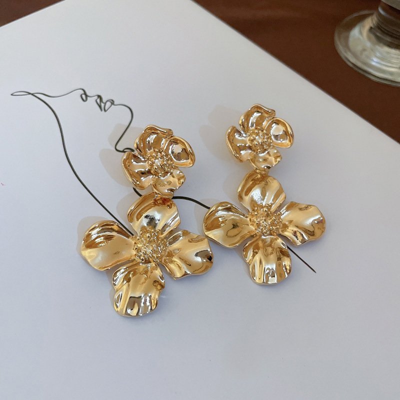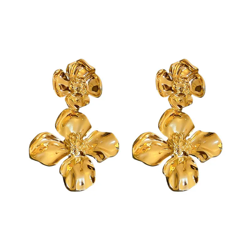 18K gold-plated stainless steel earrings with a two-tiered floral design. Hypoallergenic, tarnish-resistant, and ideal for romantic vintage & party styling.