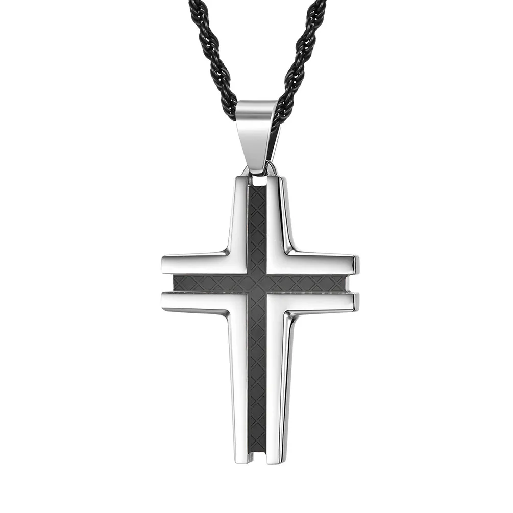 Two-tone stainless steel cross pendant with intricate grid engravings, paired with a durable twisted chain. Hypoallergenic, tarnish-resistant, and rugged—perfect for men’s vintage, street, and religious styling.