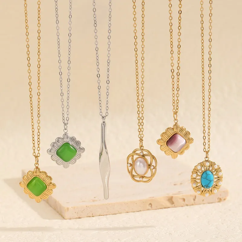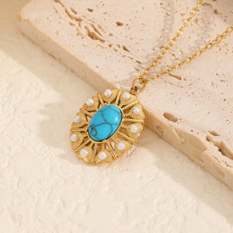 18K gold-plated stainless steel necklace with a vintage openwork frame, natural turquoise center, and pearl accents. Hypoallergenic, tarnish-resistant, and brimming with French romantic charm—ideal for elegant retro styling and everyday wear.