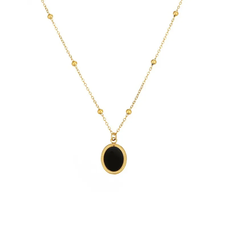18K gold-plated stainless steel beaded chain with a vintage-style oval black acrylic pendant. Hypoallergenic, tarnish-resistant, ideal for minimalist elegant styling.